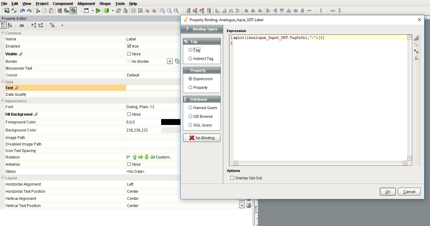 I have put together a simple template called ‘Analogue_Input_UDT’. The intended function is to display the analogue input in a numeric label and to display the tag name in a label above. The numeric indicator works perfectly. However, I’m struggling to extract the tag name from an address that is pushed to my template.