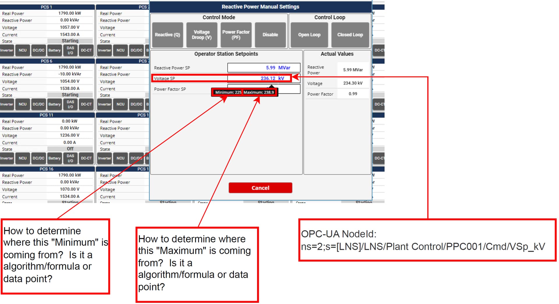There is something on the “Reactive Power Manual Settings“ HMI dialog that shows “Voltage SP“. When I mouse over this “Voltage SP“ it gives me help tips, in this case it shows “Minimum:225, Maximum:238.9“.