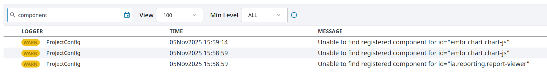 I'm seeing multiple Unable to find registered component for id = '%module% errors in my logs, which indicate that some views contain elements from modules that no longer exist. I've been deleting these elements as I go.