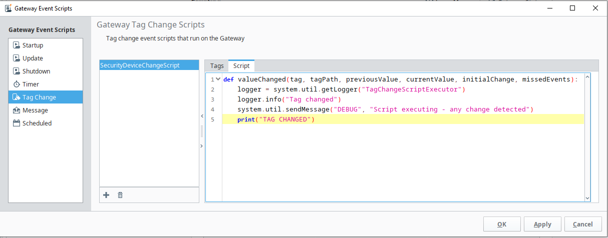 Whatever code you write in the text editor for a gateway tag change script will be directly executed.