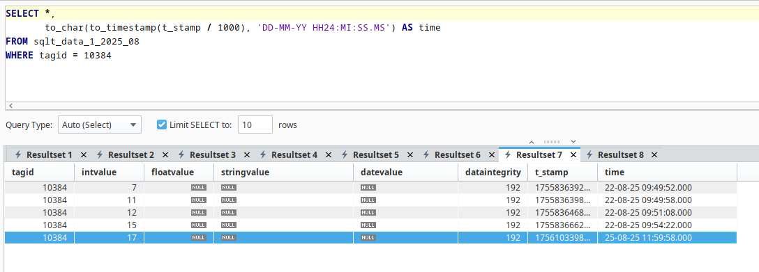 However, when I try to retrieve the values using the system.tag.queryTagHistory function always returns two rows, even though the history table contains only one row for that time range.
