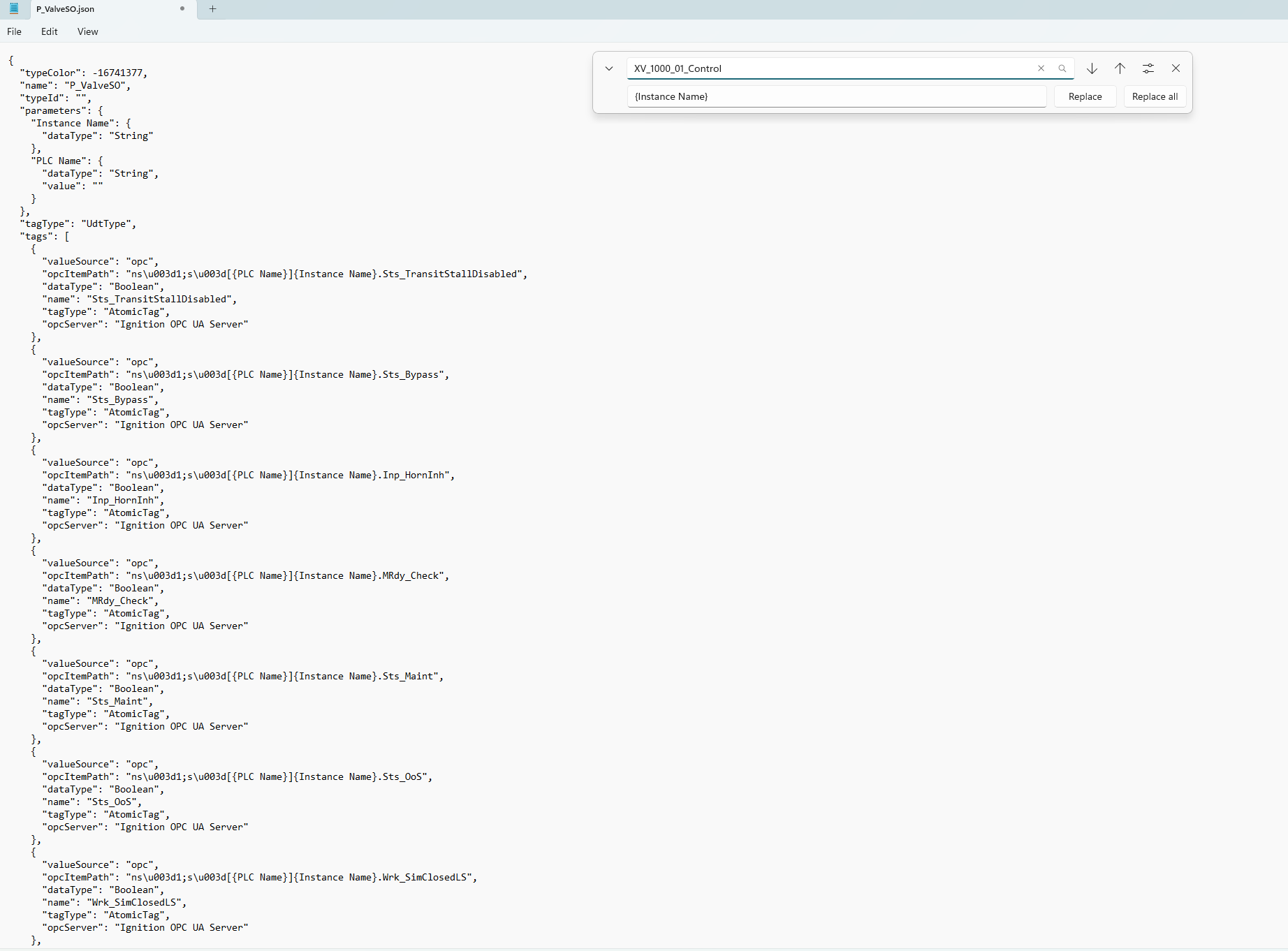 - Use find and replace function in a text editor to modify the tag paths to include {PLC Name} and {Instance Name} in place of Process_PLC and XV_1000_01_Control, respectively.