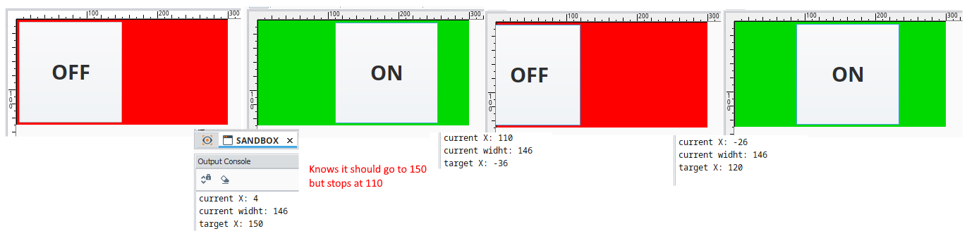 As you can see, when templated, the button doesn't slide over the right amount. I added some print statements to check the values of 'this.x', 'this.width' and 'target'. The first time I click the button, the values appear correct, but the object doesn't actually gets moved the right amount, which throws off all subsequent toggles.