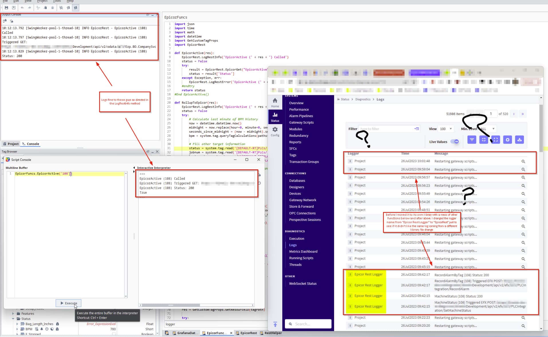 I moved the code from my EpicorFuncs library to one that was more generic for use across multiple libraries called EpicorRest. I am still getting output from that method to the Console and Script Console but not the logger anymore. All I did was move it from one library to the other trying to refactor and I can't figure out why it's being a pain in my rear.