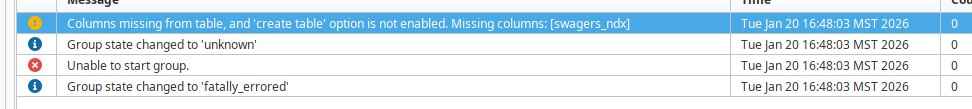 I did have the timestamp data going to the wrong DB field at first, but even after correcting that problem the group still won’t start. It almost seems like the system is still trying to complete an old (now defunct) database request.