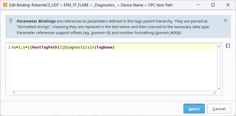 My issue is when I create a new UDT from an existing device, I want to use some of the same OPC data path I used in EFM_TF_Fuel_Recycle UDT. The devices are similar but they are slightly different in naming, EU’s and history needs. When I am modifying the tagpaths during this process, if I paste the path into each tag individually, the path will italicize. If I select a group of tags and paste the OPC data path, the path does not italicize or work when I open the individual tag to verify the path works. I have to delete the OPC data path in the tag, apply, then paste and apply for the OPC data path to take effect.